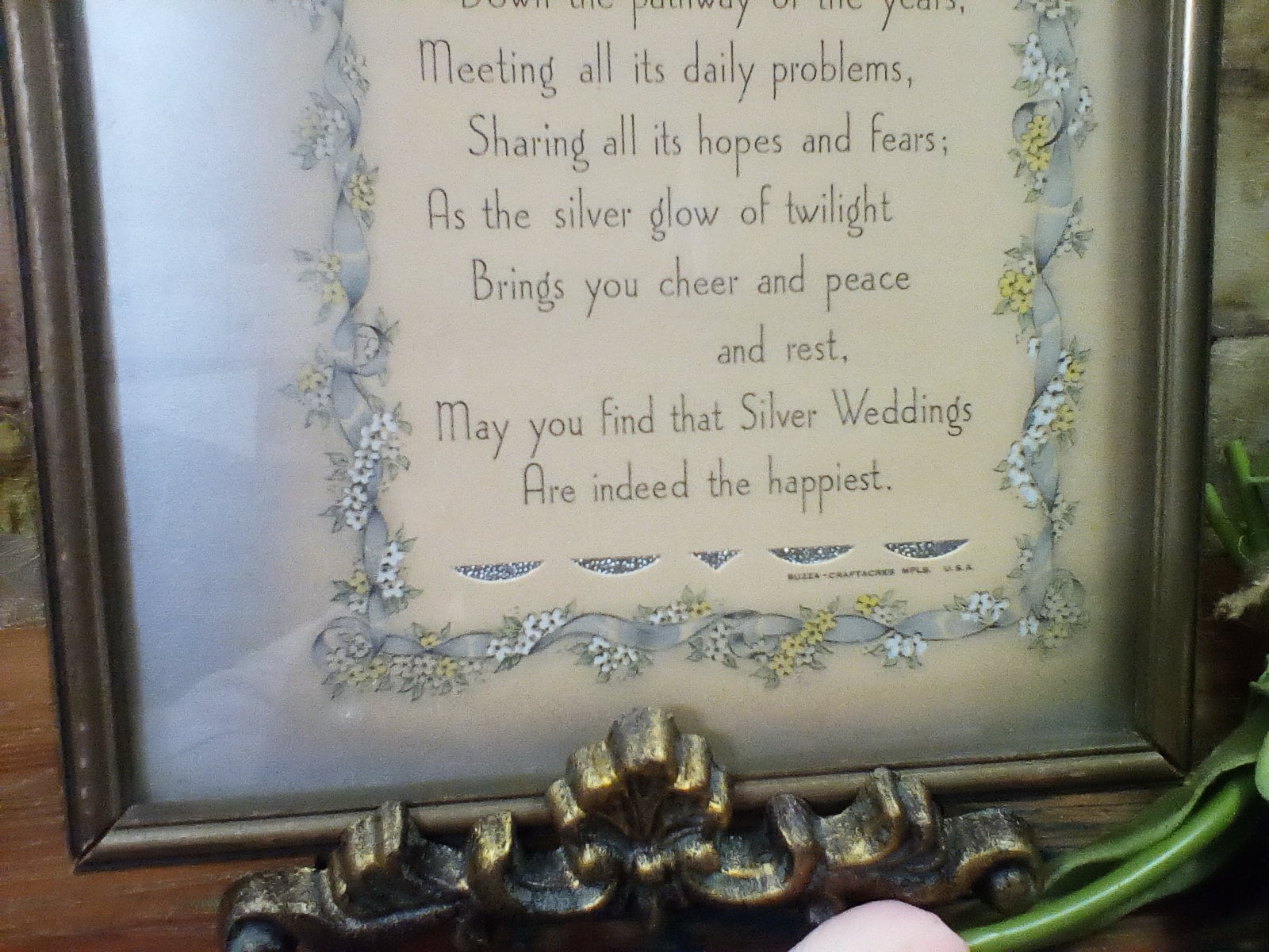 This is a rare and unique little print used to celebrate a silver wedding anniversary. The illustration is wonderful with silver bells and floral and leaf and ribbon around the poem. And here's the poem: