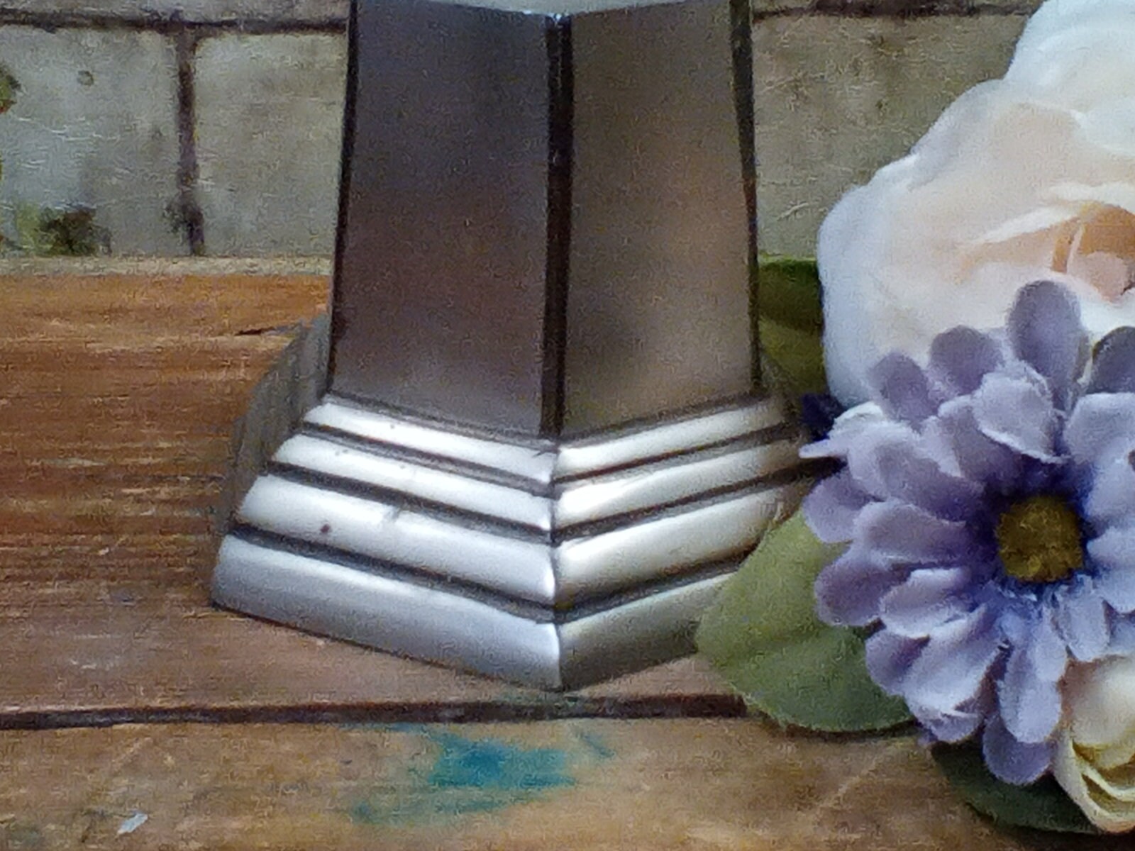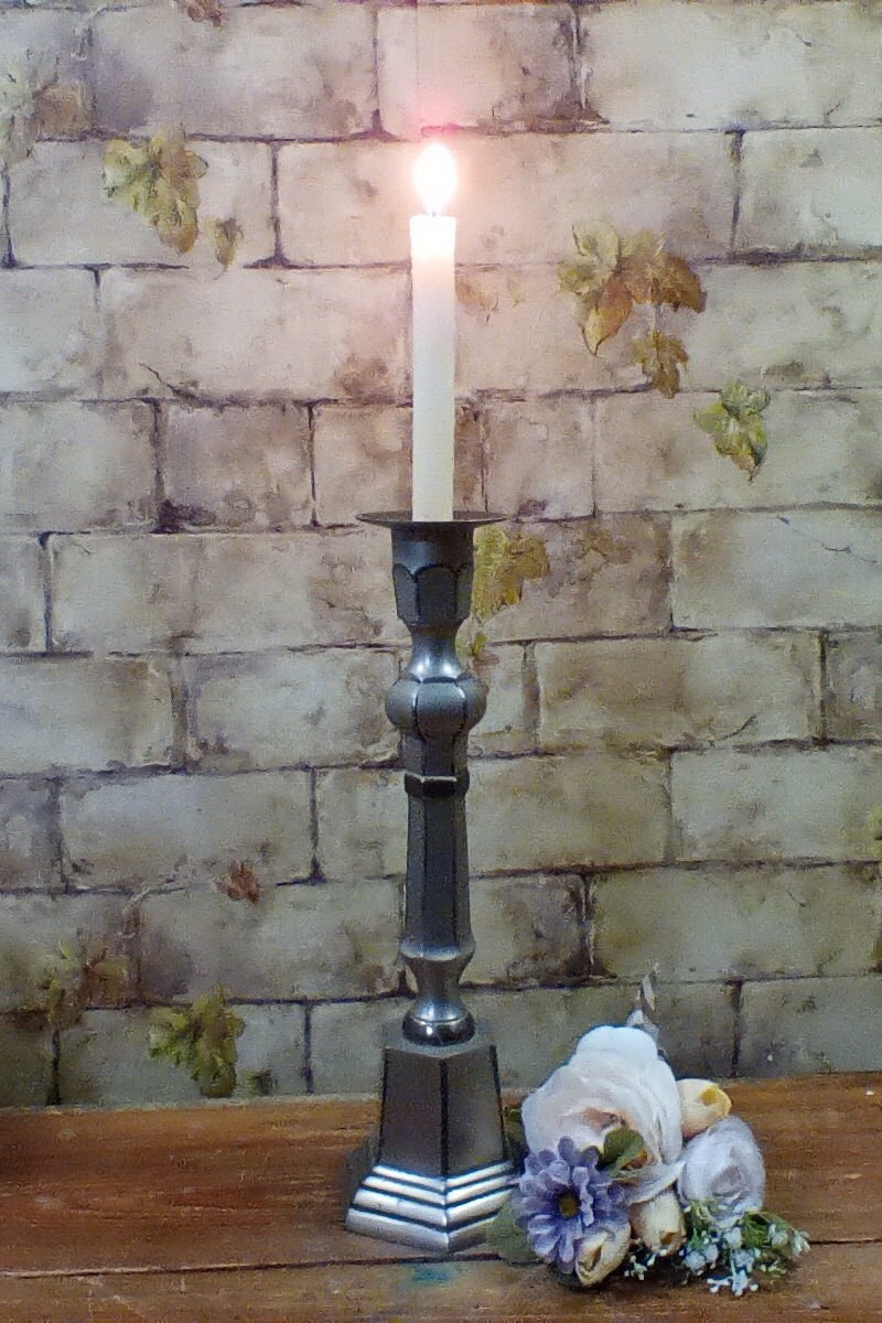 Vintage Silver Look 14" Tall Candlestick, Made in India, Metal with Distressed Silver, Taper Candle Holder from the 90s, Great Condition. This would look terrific on your fireplace or perhaps as a table centerpiece. It's really unique.Visit my shop home page at https://turnpiketreasures.etsy.com